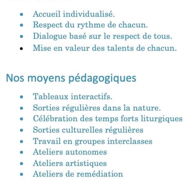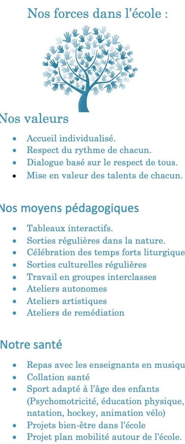 "Notre mission est d’accompagner chaque enfant dans ses apprentissages et son développement personnel, en cultivant curiosité, respect et collaboration. Nous croyons qu’une école est avant tout une communauté éducative et humaine"